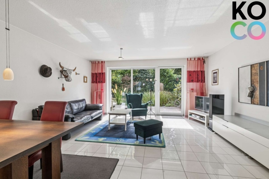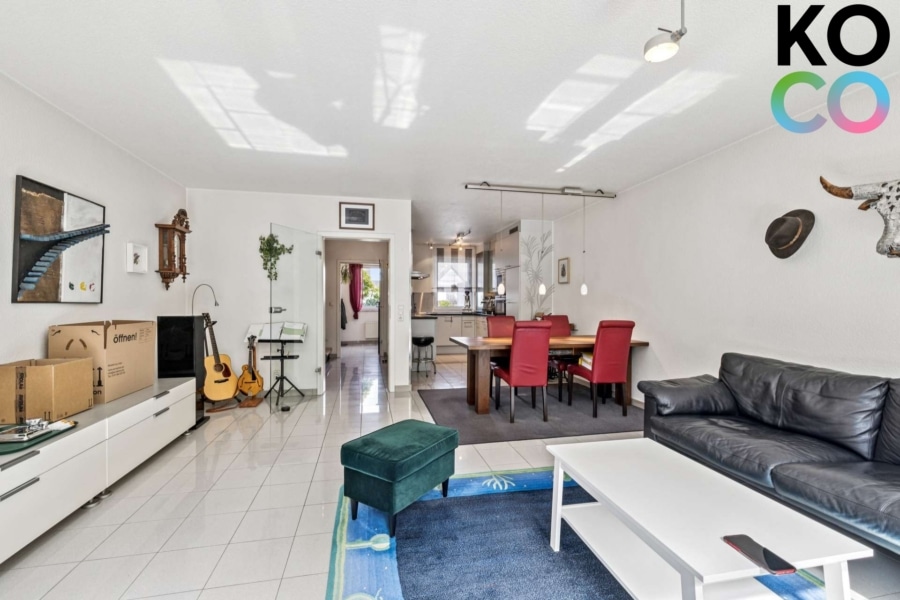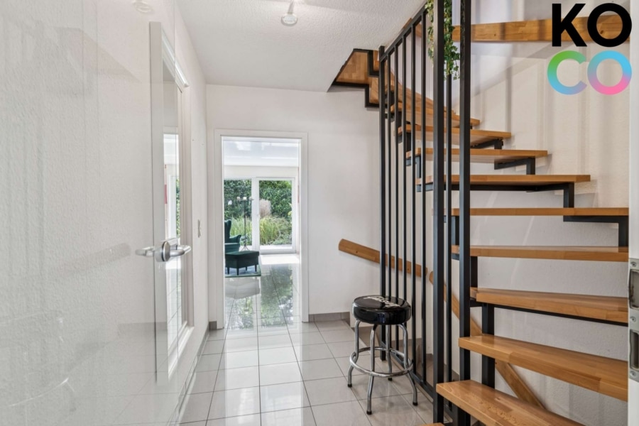 Bereits der Eingangsbereich empfängt Sie mit einer hellen, offenen Gestaltung. Das Herzstück des Hauses bildet der großzügige Wohn- und Essbereich mit bodentiefen Fenstern, die viel Tageslicht hereinlassen und zugleich den direkten Zugang zur Terrasse und in den gepflegten Garten eröffnen. Hier entstehen grüne Rückzugsorte zum Entspannen, Spielen oder für gesellige Stunden.