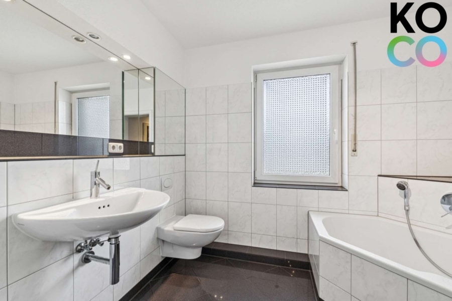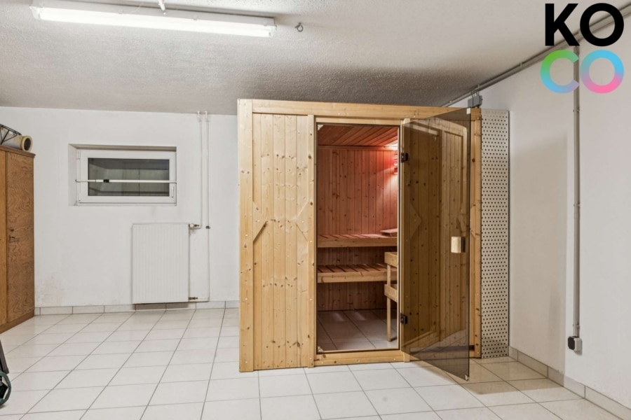 Das geschmackvoll geflieste Badezimmer mit Badewanne und Dusche schafft Raum für Wellness im Alltag. Ein besonderes Highlight befindet sich im Untergeschoss: eine eigene Sauna, die jederzeit Entspannung und Erholung ermöglicht. Neben zusätzlichem Stauraum im Keller sorgen Garage und Stellplatz direkt am Haus für den nötigen Komfort.