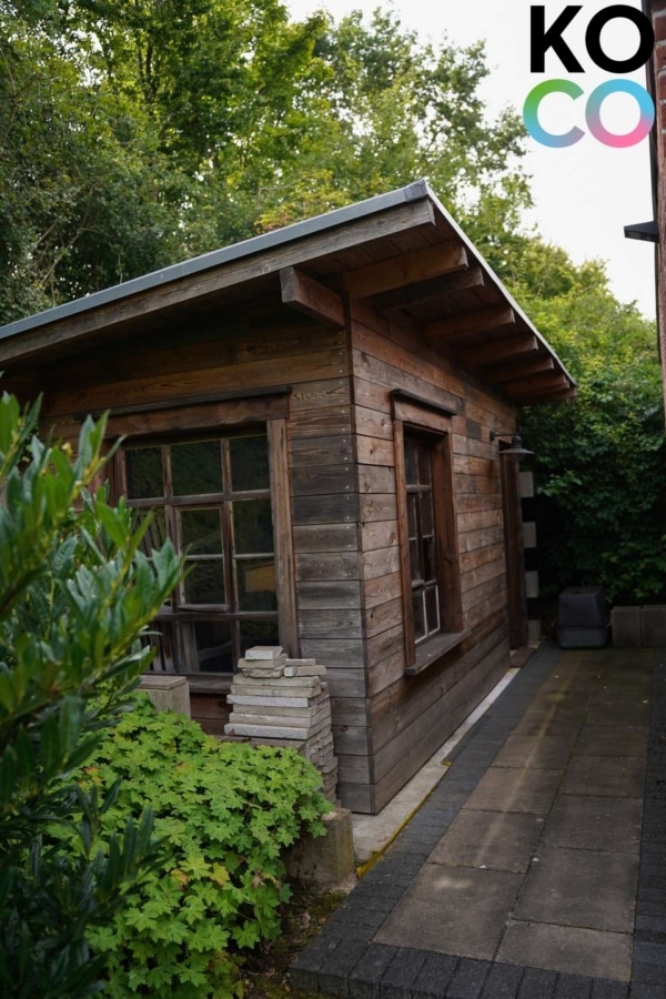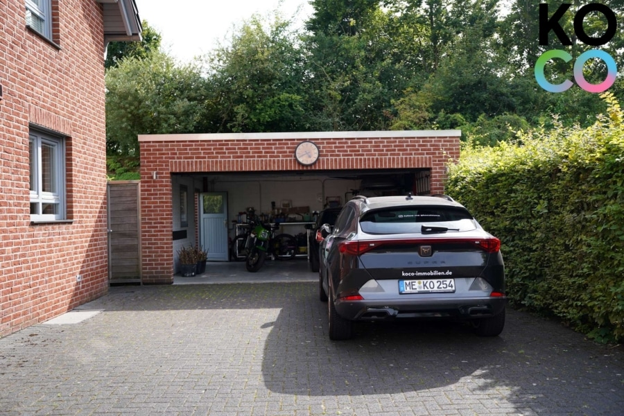 Zur Immobilie gehört eine große Garage mit viel Platz für Fahrzeuge und Fahrräder. Vor der Garage ist genügend Platz, so dass bis zu vier Fahrzeuge abgestellt werden können. Ein hübsches Gartenhaus rundet das Angebot ab.