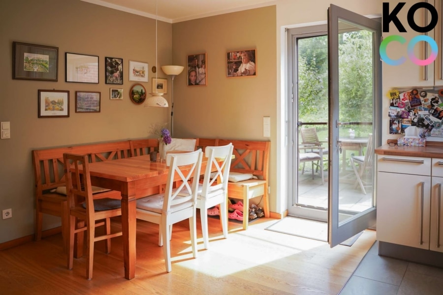 Die angrenzende Wohnküche mit gemütlicher Essecke bietet Zugang zu einer weiteren Terrasse – ideal für sonnige Frühstücke oder entspannte Abende im Freien. Ein zusätzlicher Raum, perfekt als Arbeits- oder Gästezimmer nutzbar, sowie ein Gäste-WC komplettieren das Raumangebot auf dieser Ebene.