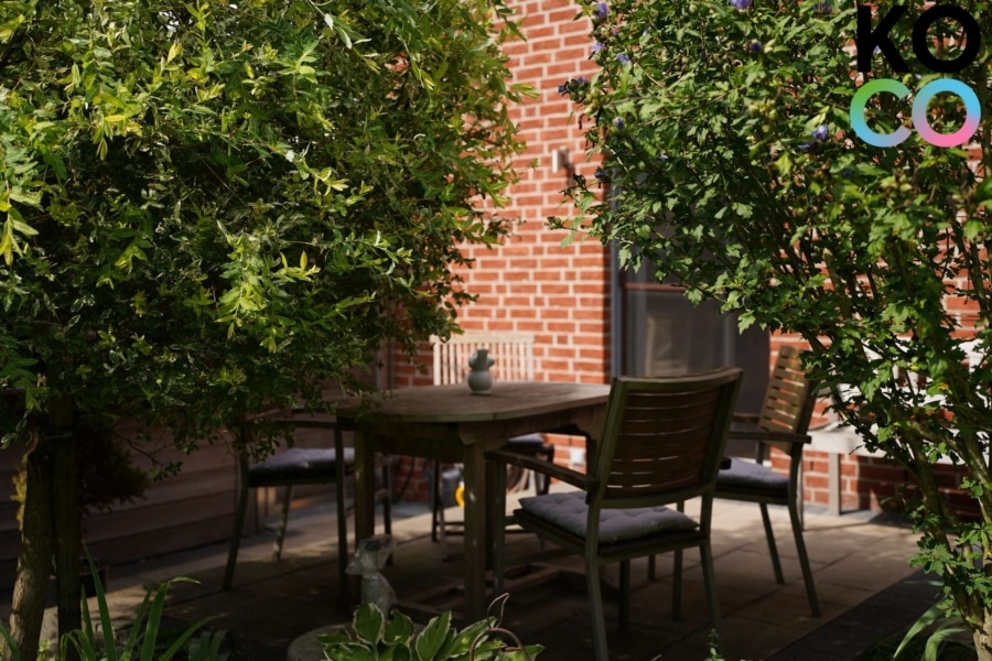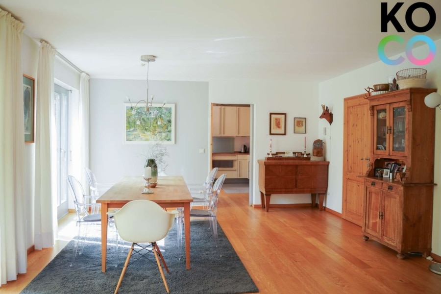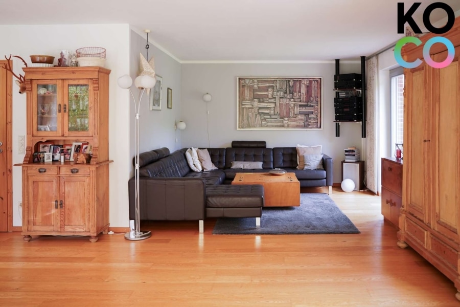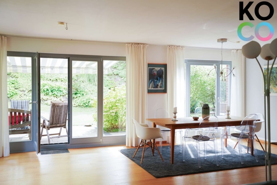 Im Erdgeschoss erwartet Sie ein offenes, helles Wohnkonzept: Elegantes Eichenparkett und eine behagliche Fußbodenheizung sorgen für Wohnkomfort auf hohem Niveau. Das großzügige Wohnzimmer mit integriertem Essbereich ist von bodentiefen Fenstern umgeben, die den Blick in den liebevoll angelegten Garten mit vorgelagerter Terrasse freigeben. Der Garten ist mit seiner Größe in dieser Siedlung eine absolute Rarität und bietet genug Raum für Hobbygärtner, Kinder und Grillfeste.