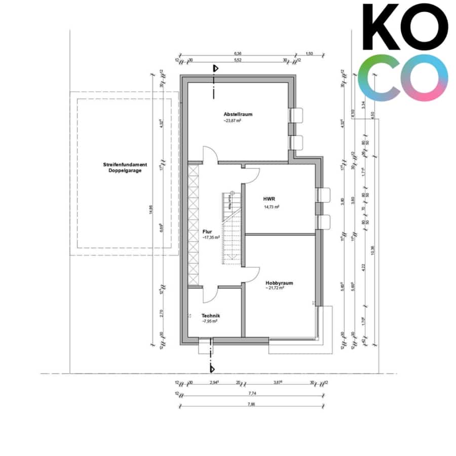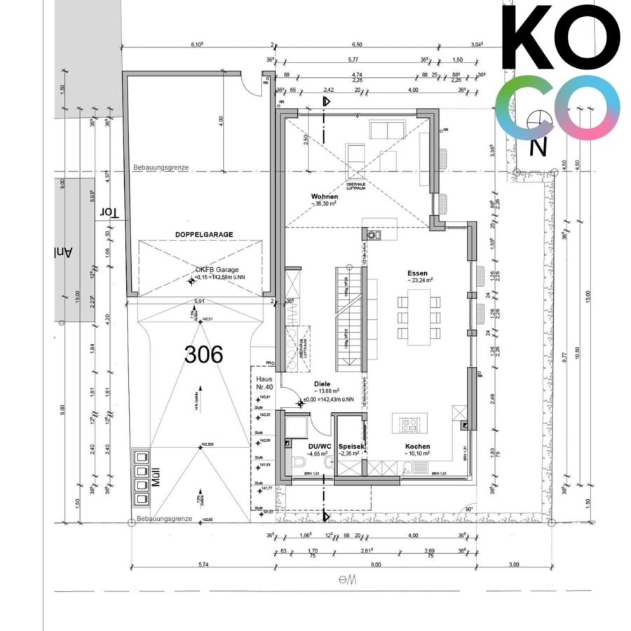 Die ca. 65 m² große Doppelgarage ist vom Garten zugänglich, mit elektrischem Sektionaltor, allen haustechnischen Anschlüssen und Wallbox ausgestattet. Die Zufahrt bietet Ihnen zusätzliche Stellplätze. Anschlüsse für ein elektrisch betriebenes Zufahrtstor sind vorhanden.