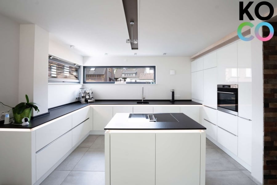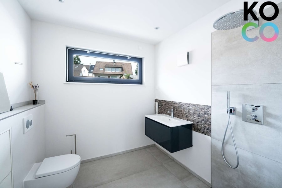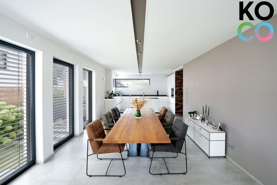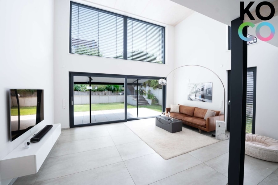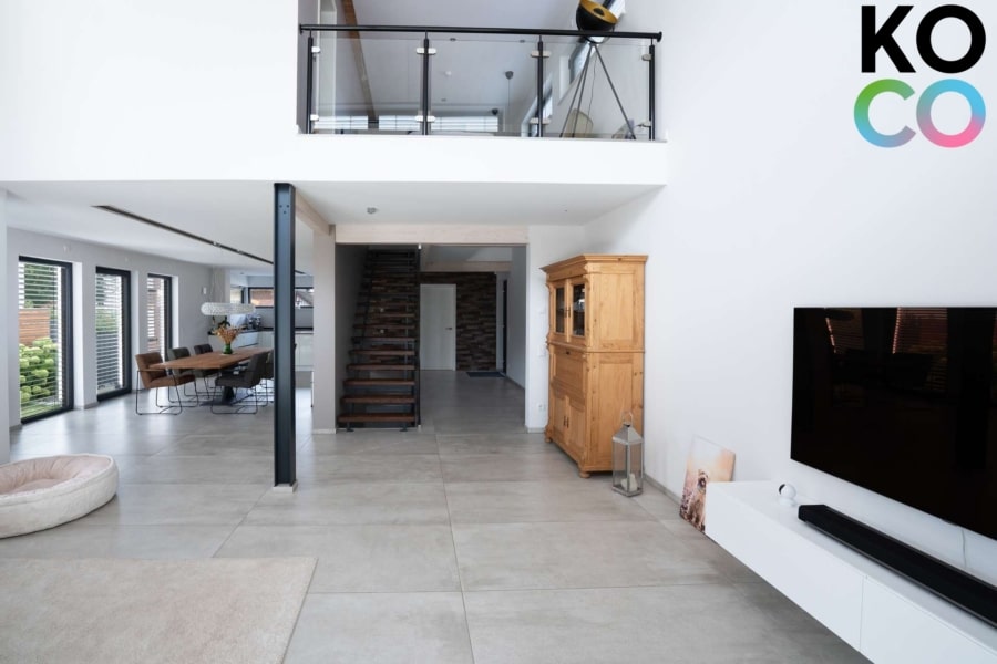 Im Erdgeschoss finden Sie Diele und Gäste-Bad mit begehbarer Dusche. Die offene Küche mit Kochinsel und hochwertiger Markentechnik geht nahtlos in den Essbereich über, in dem ein Esstisch für 10 Personen Platz findet. Angeschlossen ist der Wohnbereich mit großflächiger Verglasung, direktem Zugang zur Terrasse und in den Garten. Das absolute Highlight ist die über 5 Meter hohe, bis ins Obergeschoss geöffnete Decke, von der Sie auf die offene Galerie blicken.