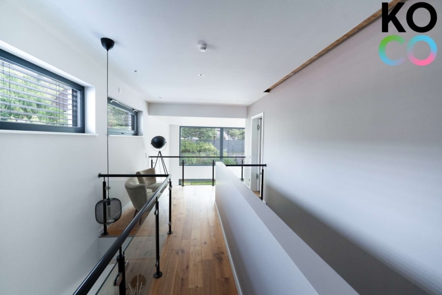 Die Treppe aus der Diele führt Sie ins Obergeschoss mit Hauptschlafzimmer, angrenzender Ankleide und En-suite-Bad – ausgestattet mit Doppelwaschtisch, großer Badewanne, separater Regendusche und separatem WC. Ein weiteres Zimmer lässt sich flexibel als Kinder-, Gäste- oder Arbeitszimmer nutzen. Ein Abstellraum ergänzt das Raumangebot. Von der Galerie überblicken Sie den Wohnbereich, die Terrasse und den Garten.