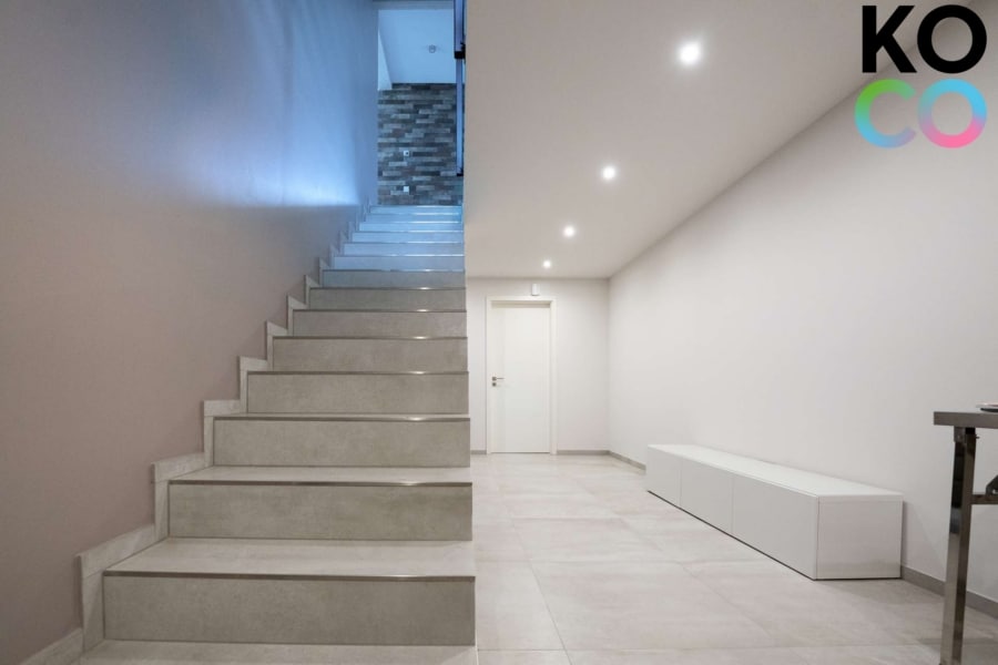 Das Kellergeschoss mit ca. 84 m² und einer Raumhöhe von 2,46 m ist wohnlich ausgebaut und bietet neben einem großzügigen Flur vier weitere Räume, die Sie als Büro- oder Atelierräume nutzen können. Der große Hauswirtschaftsraum bietet Platz für Vorräte, Waschmaschine und Trockner. Alle Anschlüsse und ein Fliesenspiegel für eine Küche sind vorbereitet.