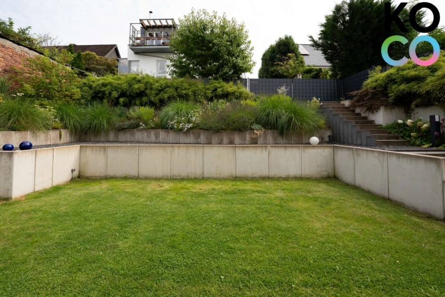 Die Terrasse mit elektrischer Markise und der Garten sind nach Süden ausgerichtet. Die klare Formensprache des Hauses setzt sich hier fort. Eine Rasenfläche bietet Freiraum. Der Garten ist stufenförmig eingefasst, mit hohen L-Steinen begrenzt und durch ausgewählte Bepflanzung ergänzt – für Ruhe, Sichtschutz und Privatsphäre.