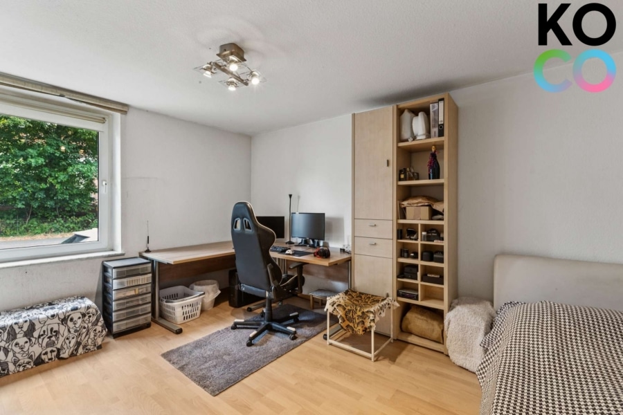 Im Obergeschoss liegt eine ca. 90 Quadratmeter große Einheit mit klassischem Grundriss und hellen Wohnräumen.