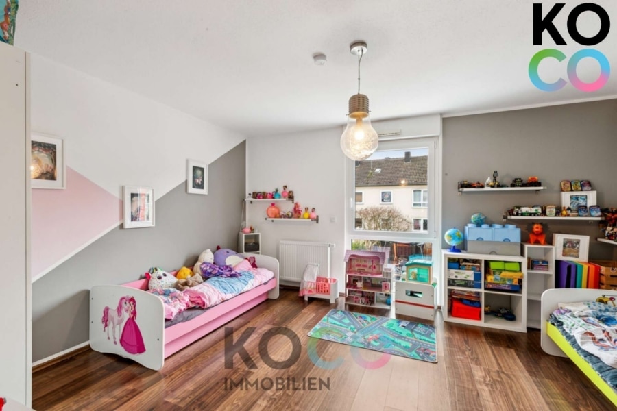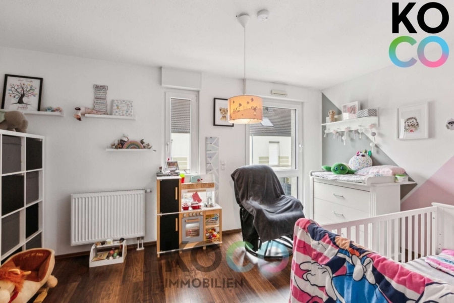 Im Obergeschoss stehen zwei helle Schlafzimmer zur Verfügung, während das Dachgeschoss ein weiteres, großzügiges Zimmer bereithält, das aktuell als Elternschlafzimmer genutzt wird. Die offene Küche fügt sich harmonisch in den Wohnbereich ein und kann auf Wunsch übernommen werden.