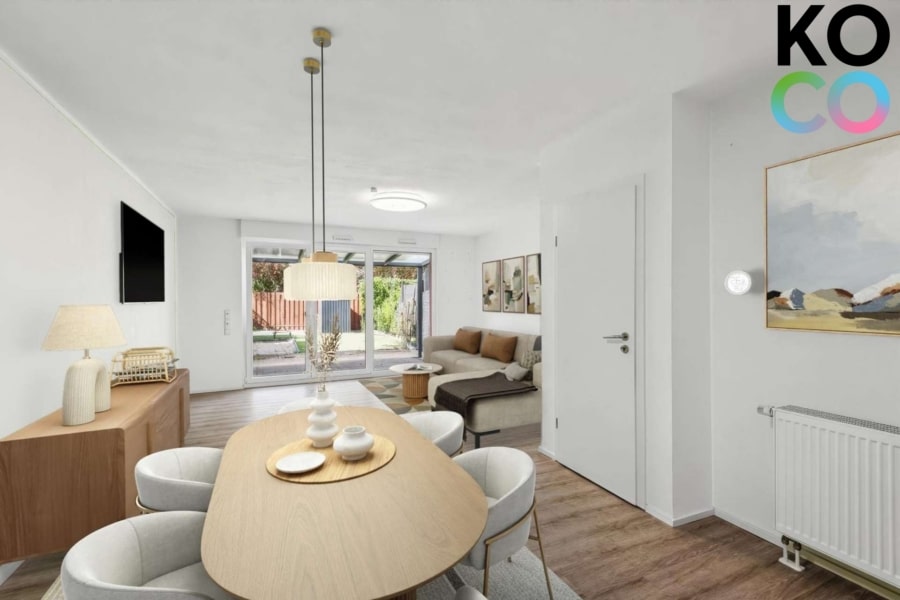 Der offene Wohn- und Essbereich besticht durch viel Tageslicht und einen harmonischen Übergang in den Garten. Großzügige Fenster schaffen eine helle Atmosphäre und eröffnen den Blick ins Grüne. Die überdachte Terrasse erweitert den Wohnraum ins Freie und lädt zu entspannten Stunden und geselligen Momenten ein.