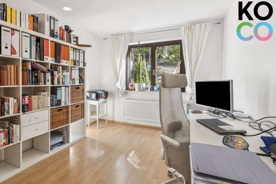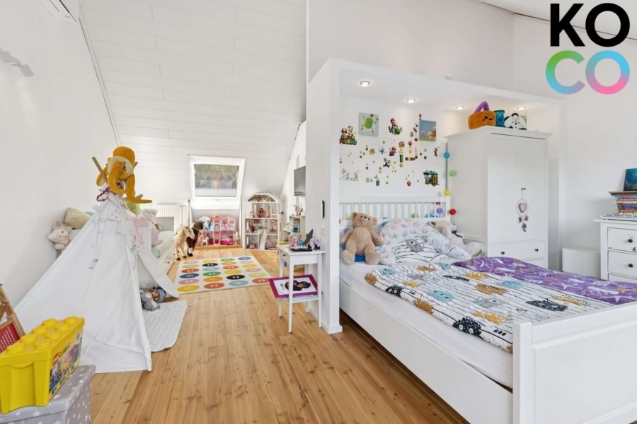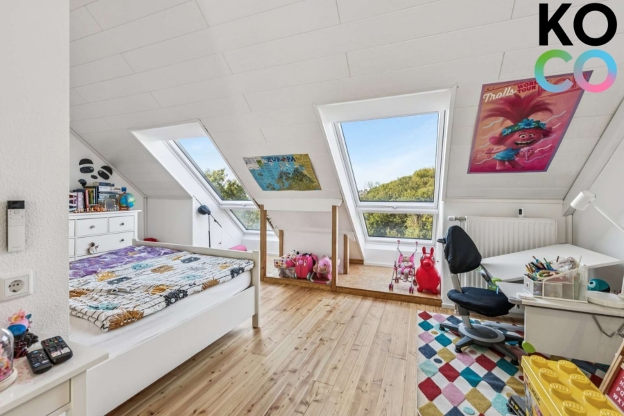 Das ausgebaute Studio im Dachgeschoss ist ein echtes Highlight: großzügig, hell und mit Echtholzdielen aus Lärche ausgestattet. Zwei große, bodentiefe Velux-Kippfenster mit elektrischen, automatisierbaren Rollläden eröffnen den Blick in Garten und Landschaft; ein weiteres Fenster geht zur Vorderseite. Alle Dachgeschossfenster sind dreifach verglast. Ergänzt wird diese Ebene durch ein zweites Tageslichtbad mit Dusche. Die Klimaanlage von 2023 sorgt im Sommer für angenehme Temperaturen und beheizt das Dachgeschoss im Winter.