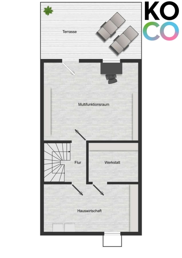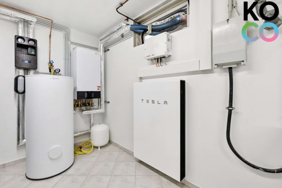 Der Keller ist voll in das Wohnkonzept integriert und bietet mehr als klassischen Stauraum. Ein modern ausgestatteter Hauswirtschaftsraum mit Anschlüssen für Waschmaschine und Trockner, Wärmepumpen-Inneneinheit, Glasfaseranschluss sowie einer 13,5 kWh Tesla Powerwall 2 inklusive Notstromsystem steht zur Verfügung. Hinzu kommen eine kleine Werkstatt sowie ein weiterer großer, multifunktional nutzbarer Kellerraum. Von hier gelangt man auf die Terrasse und in den Garten. Die Terrassentür ist – ebenso wie die Haustür – mit einem automatischen Schließmechanismus ausgestattet.