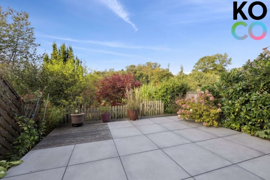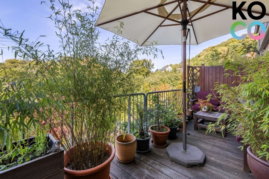 Der Garten in Hanglage bietet Sonne ab dem Nachmittag. Direkt am Haus befindet sich eine große Terrasse, teilweise durch den Balkon überdacht. Sie wurde 2022 mit rutschhemmendem Feinsteinzeug und Bankiraiholz-Dielen angelegt. Weitere Gartenebenen sind über einen geschwungenen Treppenverlauf verbunden. Im untersten Bereich steht ein Gartenhaus mit Netzwerk- und Glasfaseranschluss zur Verfügung.