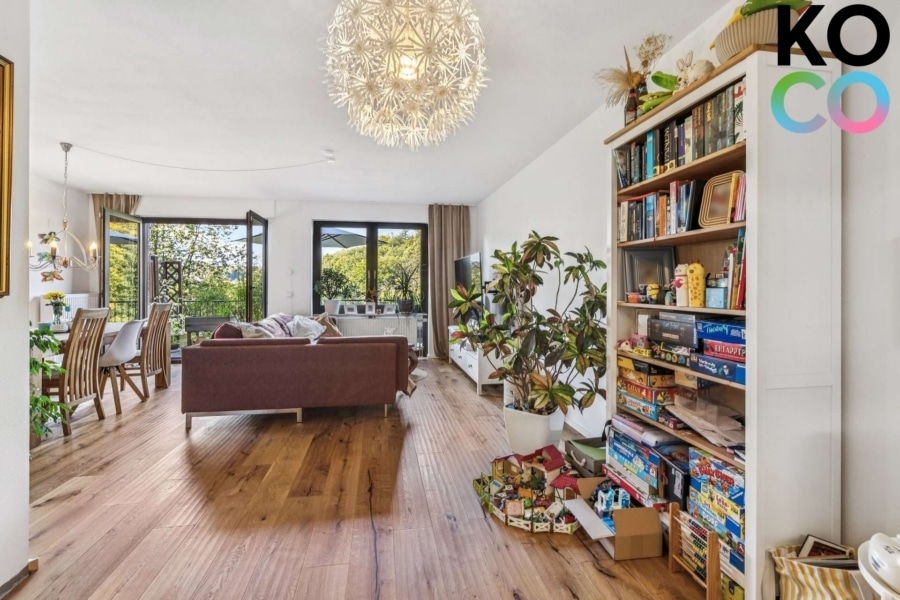 Das Erdgeschoss bildet den zentralen Lebensmittelpunkt des Hauses. Der geräumige Wohn- und Essbereich begeistert mit seiner beeindruckenden Aussicht und direktem Zugang zum Balkon – ein Ort zum Entspannen und Genießen wunderschöner Sonnenuntergänge. Hochwertige Echtholzdielen in Eiche verleihen dem Raum eine warme Atmosphäre. Die offene Küche ist harmonisch integriert und Bestandteil des Angebots. Diele und Gäste-WC komplettieren diese Ebene. Die Diele und der Küchenbereich wurden 2023 mit hochwertigen, großformatigen Fliesen ausgestattet.