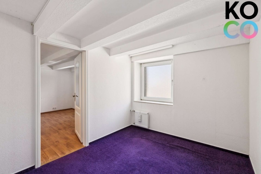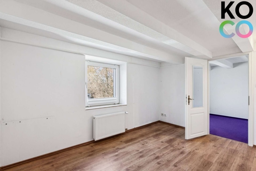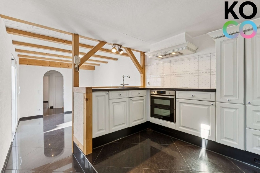 Der Wohnbereich der Wohnung befindet sich im Erdgeschoss und vermittelt eine angenehme, wohnliche Atmosphäre. Sichtbare Holzbalkenelemente verleihen den Räumen einen besonderen Charakter und unterstreichen den charmanten Altbauflair der Immobilie. Große Fensterflächen sorgen für viel Tageslicht und schaffen eine helle und freundliche Wohnsituation. Für zusätzlichen Komfort sorgt die im Erdgeschoss installierte Fußbodenheizung.