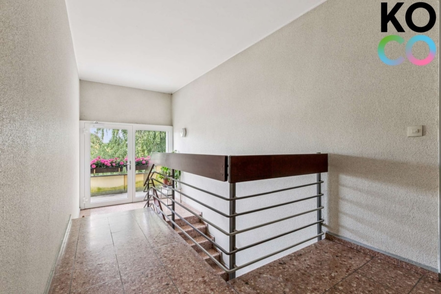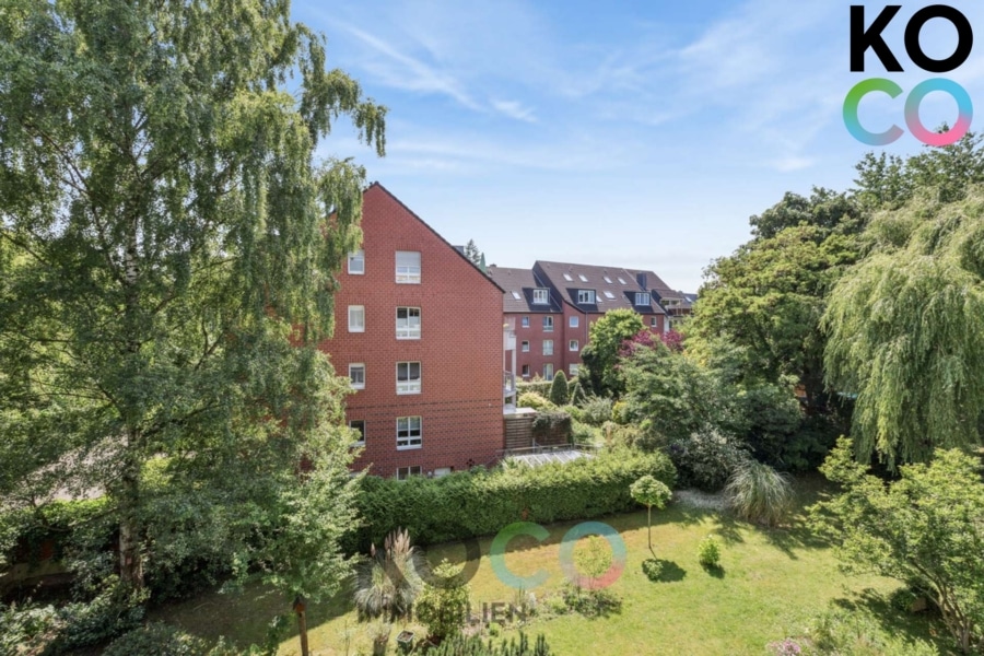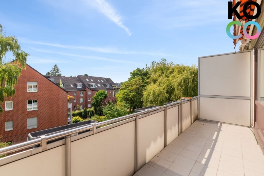 Der Balkon ist mit einer Markise ausgestattet, der perfekte Ort für eine kleine Auszeit im Grünen. Hier genießen Sie den Blick auf gepflegte Gartenflächen und gewachsenen Baumbestand, ein idyllischer Rückzugsort mitten im Alltag.