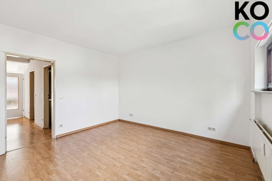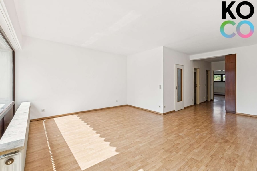 Beim Betreten der Wohnung erwartet Sie zunächst eine klassische Diele mit praktischer Raumaufteilung. Herzstück der Wohnung ist der großzügige Wohn- und Essbereich mit direktem Zugang zum Balkon. Großzügige Fensterflächen lassen viel Tageslicht herein und schaffen ein freundliches Ambiente. Elektrische Rollläden im Wohnzimmer bieten zusätzlichen Komfort und Sichtschutz.