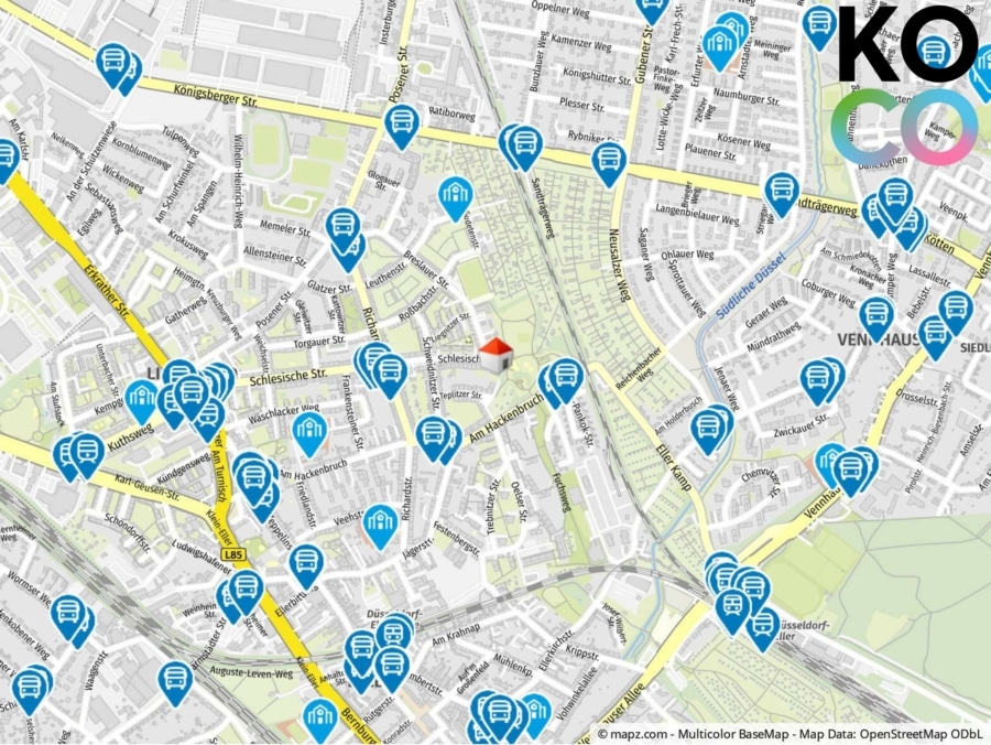 Die Anbindung an den öffentlichen Nahverkehr ist hervorragend: Straßenbahnen und Buslinien sind nur wenige Gehminuten entfernt und bieten schnelle Verbindungen in die Innenstadt sowie zu anderen Stadtteilen Düsseldorfs. Auch mit dem Auto ist die Lage attraktiv – über die nahegelegenen Zufahrten zur A46 und A59 erreichen Sie das regionale und überregionale Straßennetz in kurzer Zeit.