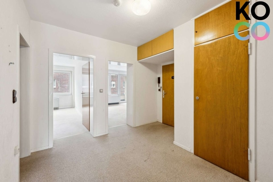 Die Wohnung ist sowohl über das Treppenhaus als auch bequem über den Aufzug erreichbar und empfängt Sie mit einem zentralen Eingangsbereich, von dem aus alle Räume erschlossen werden.