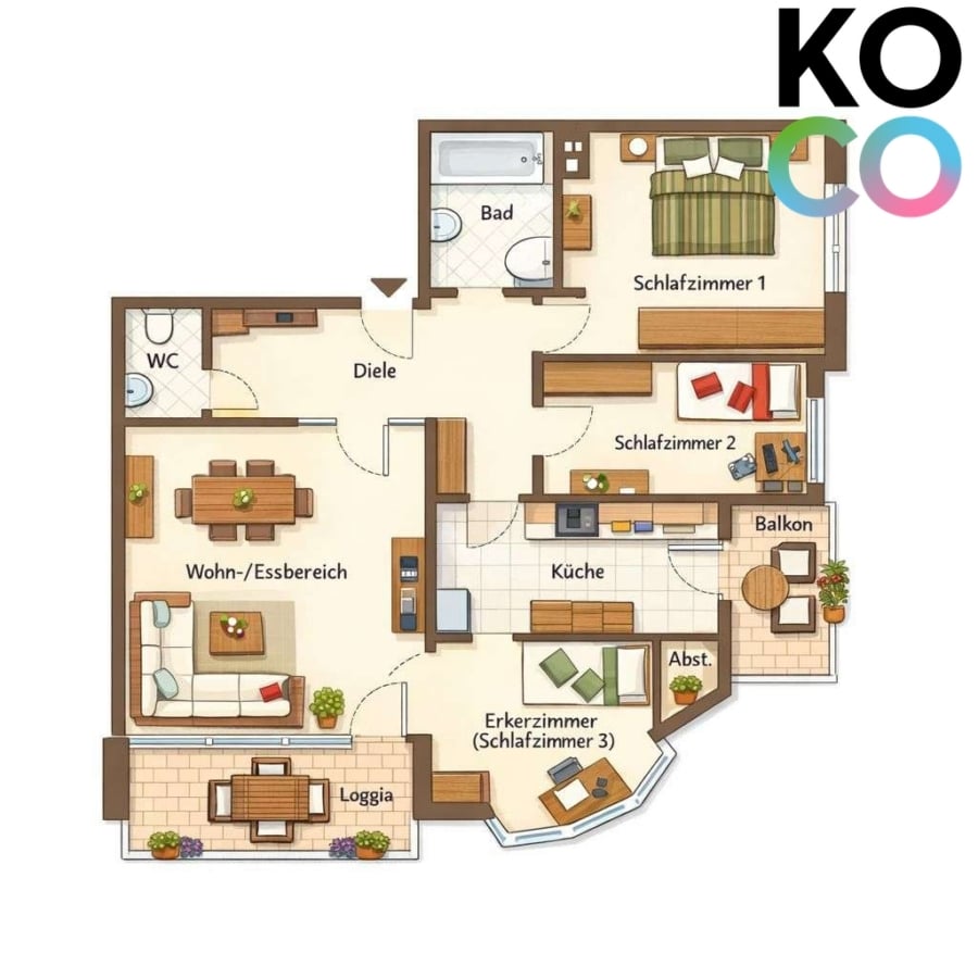 Bereits beim Betreten der Wohnung empfängt Sie eine einladende Diele, von der aus alle Räume bequem erreichbar sind. Das großzügige Wohnzimmer, das viel Tageslicht empfängt, bildet den Mittelpunkt der Wohnung und bietet direkten Zugang zur geschützten Loggia, die zu entspannten Stunden im Freien einlädt.