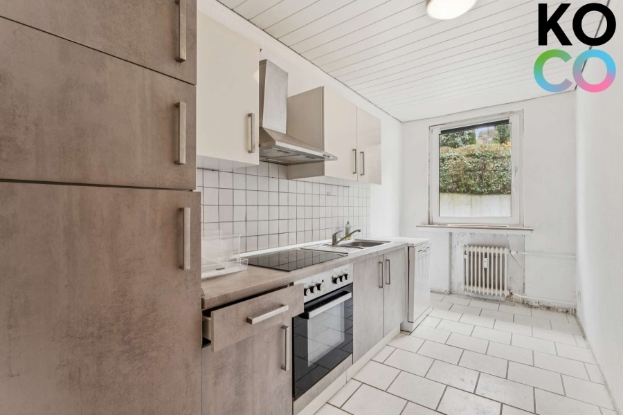 Der großzügige Wohnbereich bildet das Herzstück der Wohnung und besticht durch seine angenehme Raumgröße sowie große Fensterflächen, die für eine freundliche und helle Wohnatmosphäre sorgen. Von hier aus gelangt man direkt auf den Balkon, der den Wohnraum spürbar erweitert und sowohl Eigennutzern als auch Mietern einen echten Mehrwert bietet. Die separate Küche ist klar vom Wohnbereich getrennt und bietet ausreichend Platz für eine moderne Küchenlösung.