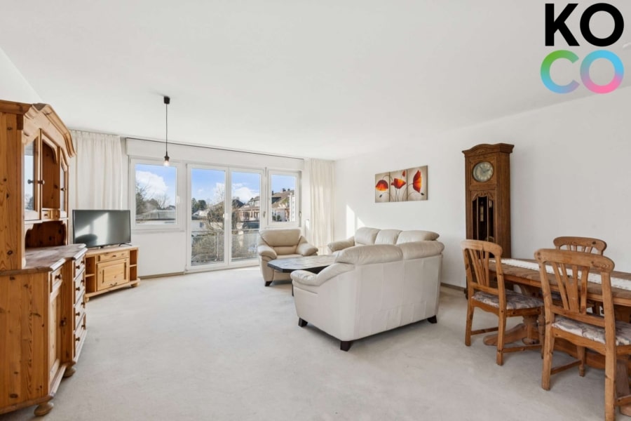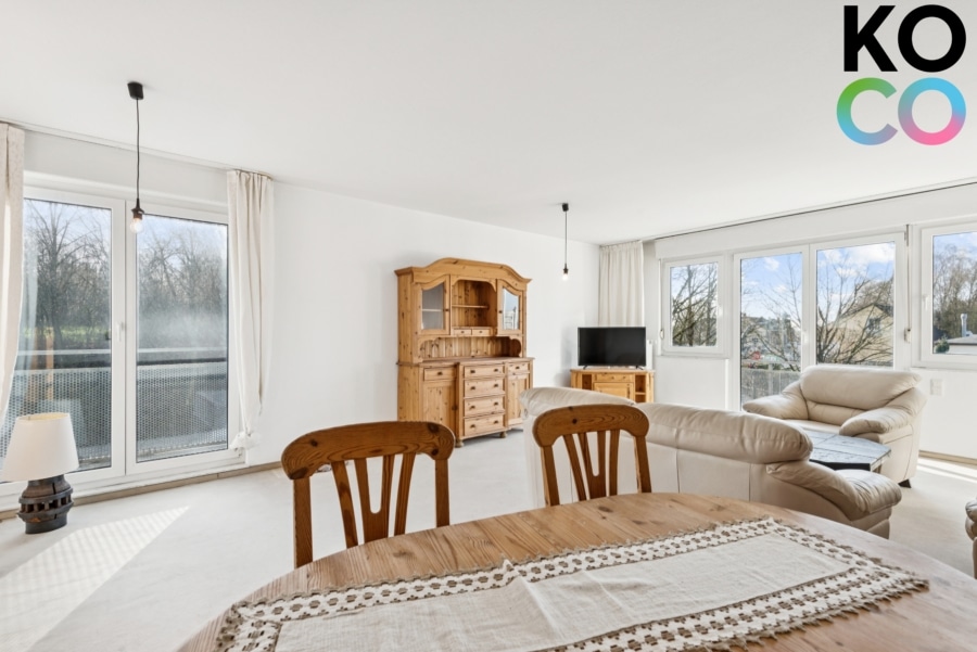 Der offen gestaltete Wohnbereich bildet den zentralen Mittelpunkt der Wohnung und bietet durch große Fensterflächen ein freundliches, offenes Raumgefühl. Von hier aus gelangen Sie direkt auf den Balkon, der den Wohnraum sinnvoll erweitert und Platz für entspannte Stunden im Freien bietet.