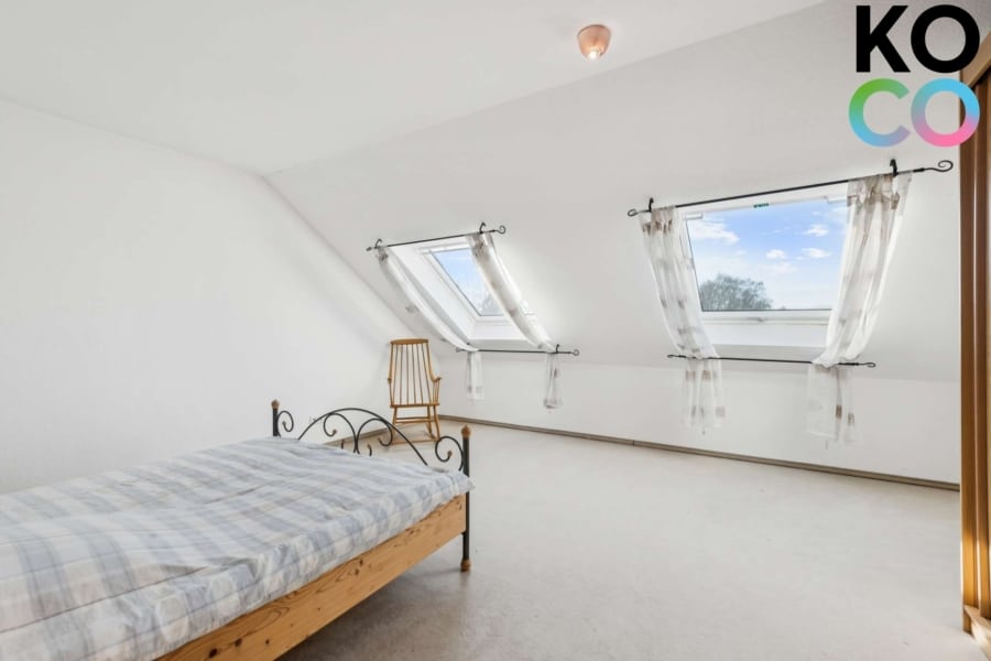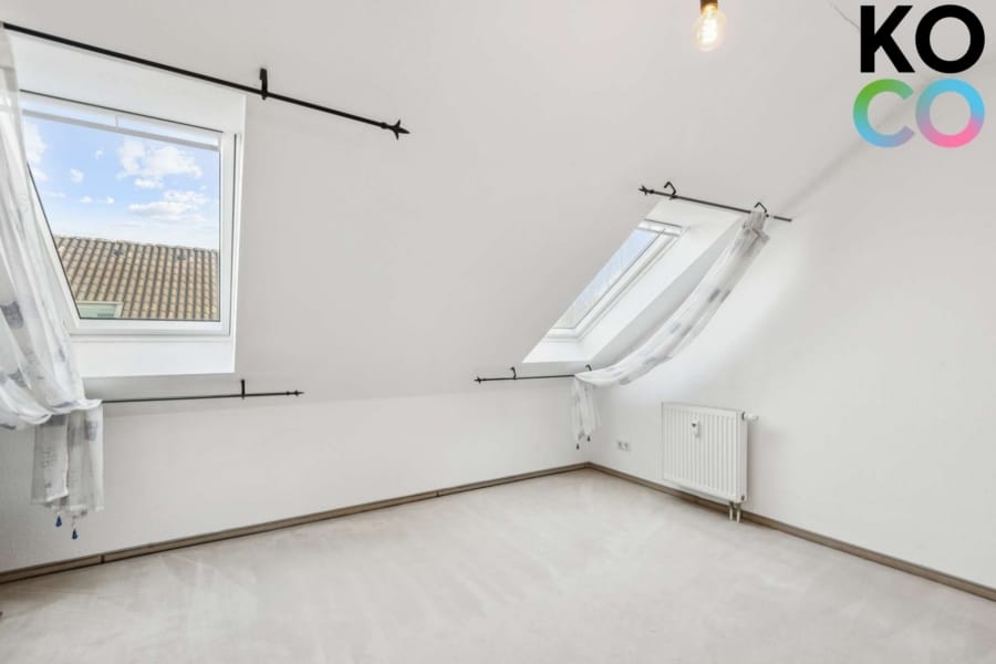 Über eine interne Treppe gelangt man in die obere Wohnebene. Hier befinden sich die weiteren Zimmer, die großzügig geschnitten sind und sich flexibel als Schlaf-, Kinder- oder Arbeitszimmer nutzen lassen. Das Badezimmer ist hell und funktional gestaltet und fügt sich stimmig in das Gesamtkonzept der Wohnung ein.