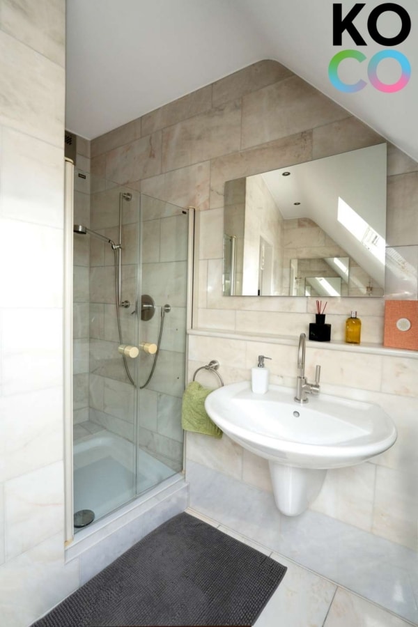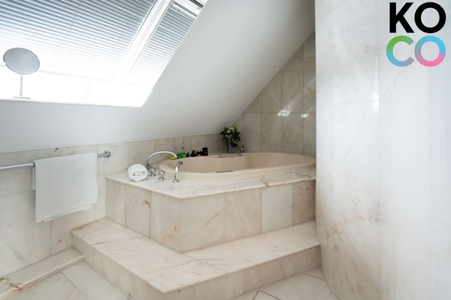 Das En-suite-Bad ist zweigeteilt. Es bietet auf einer Seite eine begehbare Dusche und auf der anderen eine große Badewanne – ideal für einen erfrischenden Start in den Tag oder Entspannung am Abend. Es ist mit Anschlüssen für Waschmaschine und Trockner ausgestattet. Zusätzlich gibt es im Haus einen Gemeinschaftsraum mit Miele-Waschmaschine und Trockner, der allen Verfügung steht.