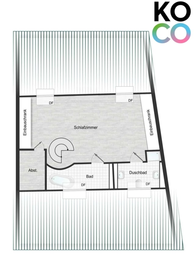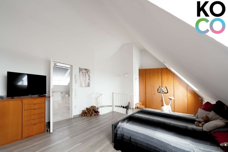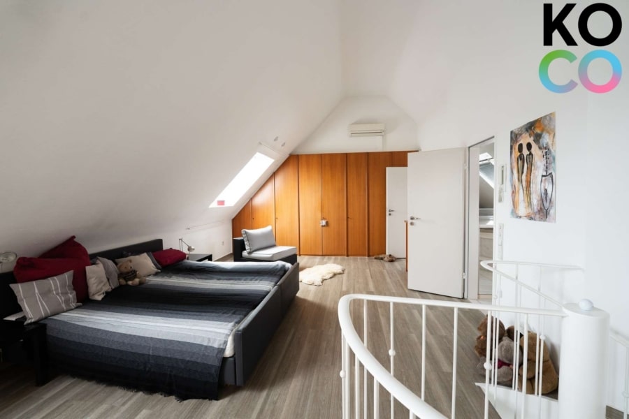 Eine Wendeltreppe führt Sie ins Obergeschoss. Hier erwartet Sie ein großzügiges Schlafzimmer, das fast die gesamte Ebene einnimmt. Die außergewöhnlich hohe Decke bis in den Spitzbogen verleiht beeindruckende Großzügigkeit und ein besonders offenes Raumgefühl. Hier finden Sie Ruhe und Platz für vieles – Yoga, Meditation oder Fitness. Zwei große, maßgefertigte Einbauschränke bieten viel Stauraum und sind stilvoll und funktional zugleich. Eine Abstellkammer neben der Wendeltreppe schafft zusätzlichen Stauraum.