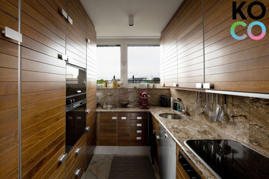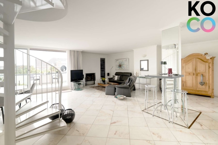 Herzstück dieser Etage ist der helle, offen gestaltete Wohn- und Essbereich. Eine ca. 3,80 Meter breite Tür-/Fensterfront öffnet sich zur uneinsehbaren Loggia. Geschützt vor Blicken genießen Sie den weiten Blick über Düsseldorf und in den rückwärtigen Gemeinschaftsgarten. Die Südausrichtung beschert ganztägig Sonne, während speziell behandelte Scheiben viel Licht hereinlassen und ein angenehmes Raumklima unterstützen. Die Tür-/Fensterfront sowie alle anderen Fenster sind dreifach verglast. Ein edler, durchgängig verlegter Marmorboden unterstreicht den großzügigen und hochwertigen Charakter. Der offene Kamin verleiht dem Raum Wärme und Gemütlichkeit – perfekt, um in kalten Zeiten mit Freunden, Familie oder einem guten Buch zu entspannen. Eine kompakte, durchdacht geplante Poggenpohl-Küche, ein praktischer, offener Arbeits- oder Gästebereich, eine Garderobe und ein Gäste-WC komplettieren diese Ebene.