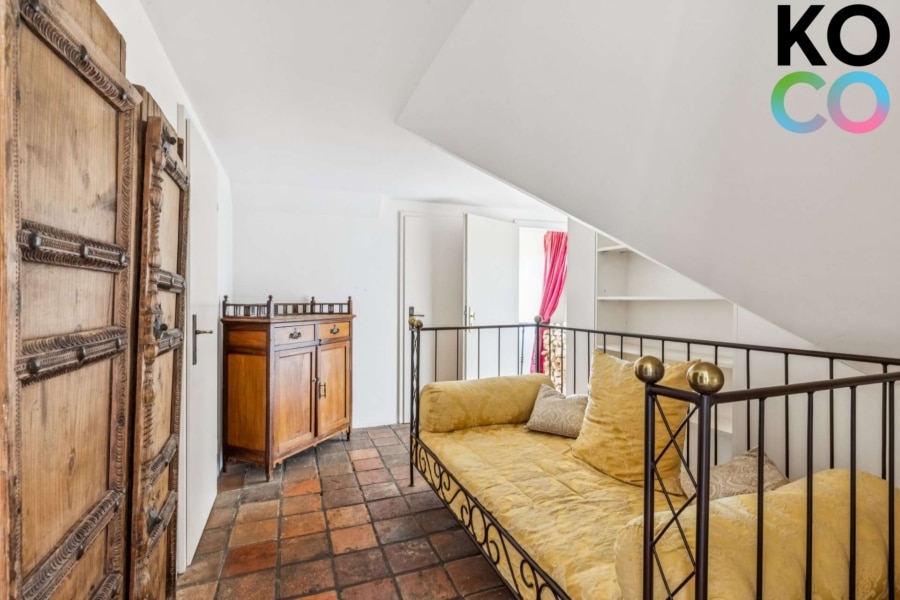 Hier gibt es ein helles Arbeitszimmer, einen kleineren Balkon und zwei Schlafzimmer: das erste mit charmanter Schlafkoje und eigenem Bad mit Dusche und Badewanne – perfekt als Gäste- oder Jugendzimmer. Das Hauptschlafzimmer hat maßangefertigte Einbauschränke und bietet Platz für individuelle Gestaltung. Eine kleine Arbeitsecke sowie ein angrenzendes Bad mit Dusche und separatem WC ergänzen das Raumangebot auf dieser Ebene.