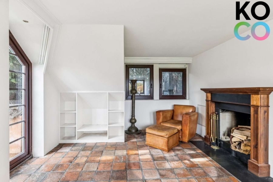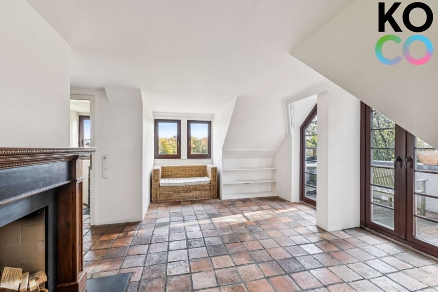 Über einen kleinen Flur kommt man ins Kaminzimmer mit offenem Kamin und Zugang zum Balkon mit Blick in den Gemeinschaftsgarten und das benachbarte Naherholungsgebiet.