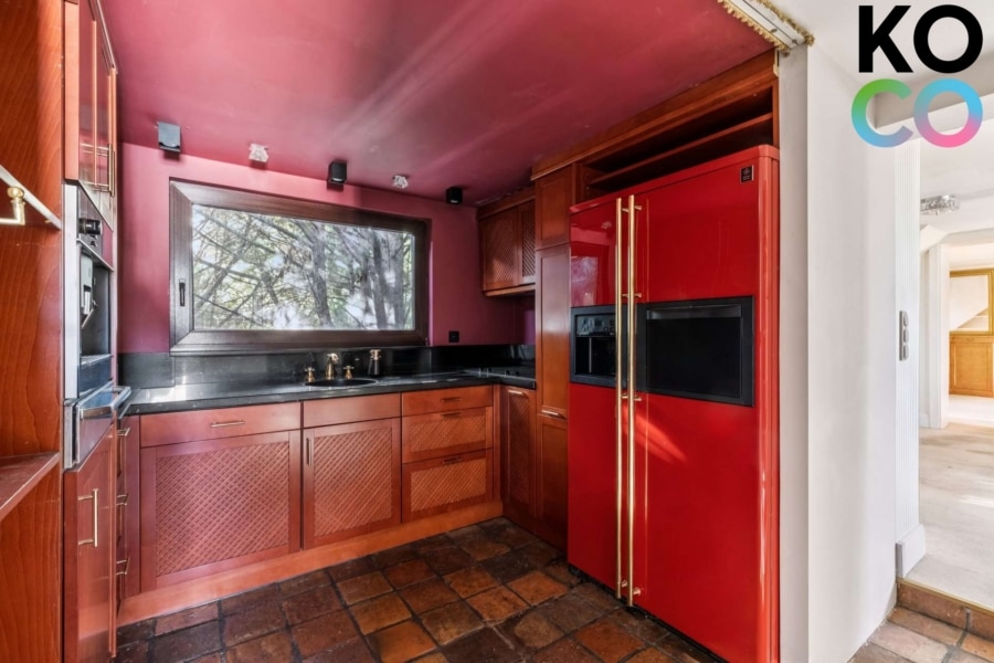 Der Essbereich bietet Platz für einen großen Tisch und hat praktische Einbauten für Geschirr und Gläser. Angrenzend: Eine stilvolle Küchennische mit Fenster zum Garten, ausgestattet mit einer Einbauküche – inklusive Kühlschrank mit Eiswürfelfunktion, Einbaukaffeemaschine und Grill.