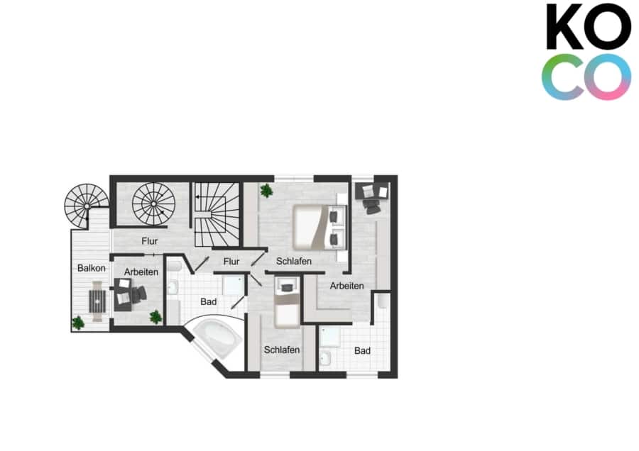 Über eine schmiedeeiserne Wendeltreppe gelangt man in den unteren Teil der Wohnung.