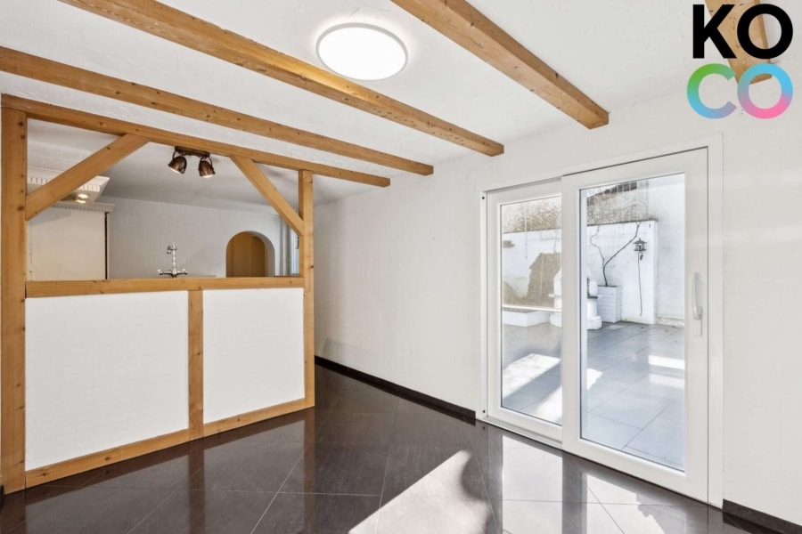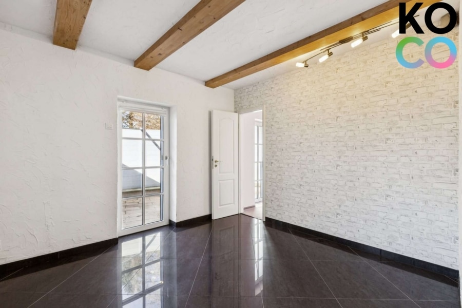 Der Wohnbereich der Wohnung befindet sich im Erdgeschoss und vermittelt eine angenehme, wohnliche Atmosphäre. Sichtbare Holzbalkenelemente verleihen den Räumen einen besonderen Charakter und unterstreichen den charmanten Altbauflair der Immobilie. Große Fensterflächen sorgen für viel Tageslicht und schaffen eine helle und freundliche Wohnsituation. Für zusätzlichen Komfort sorgt die im Erdgeschoss installierte Fußbodenheizung.